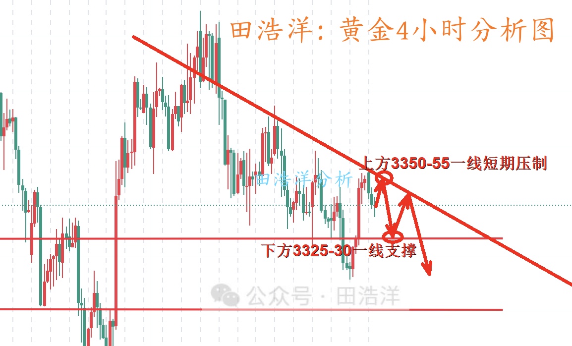 黄金昨日多头在一系列利空的因素之下绝地反击,傲立群雄,直接刷新了昨日的市场观点,也让市场再度陷入了疑惑之中,日线的大阳收盘也让多空有了很悬疑的观点,但是在本人田浩洋来看,多头依旧是纸老虎,目前上方的重压维持仍然维持于前期的高点3365-73一线附近位置,在此位置之下的话,仍然不宜过分的看多市场,而下方的支撑则继续维持于3330一线位置,如果你目前操作不理想,希望田浩洋能让你的投资少走弯路,欢迎前来沟通交流! 从4小时分析来看,今日下方支撑关注3330-35附近,上方压力关注3350-55附近,重点关注3365-73一线压制,整体依托此区间保持高空低多循环参与节奏不变。具体操作策略我会在盘中提