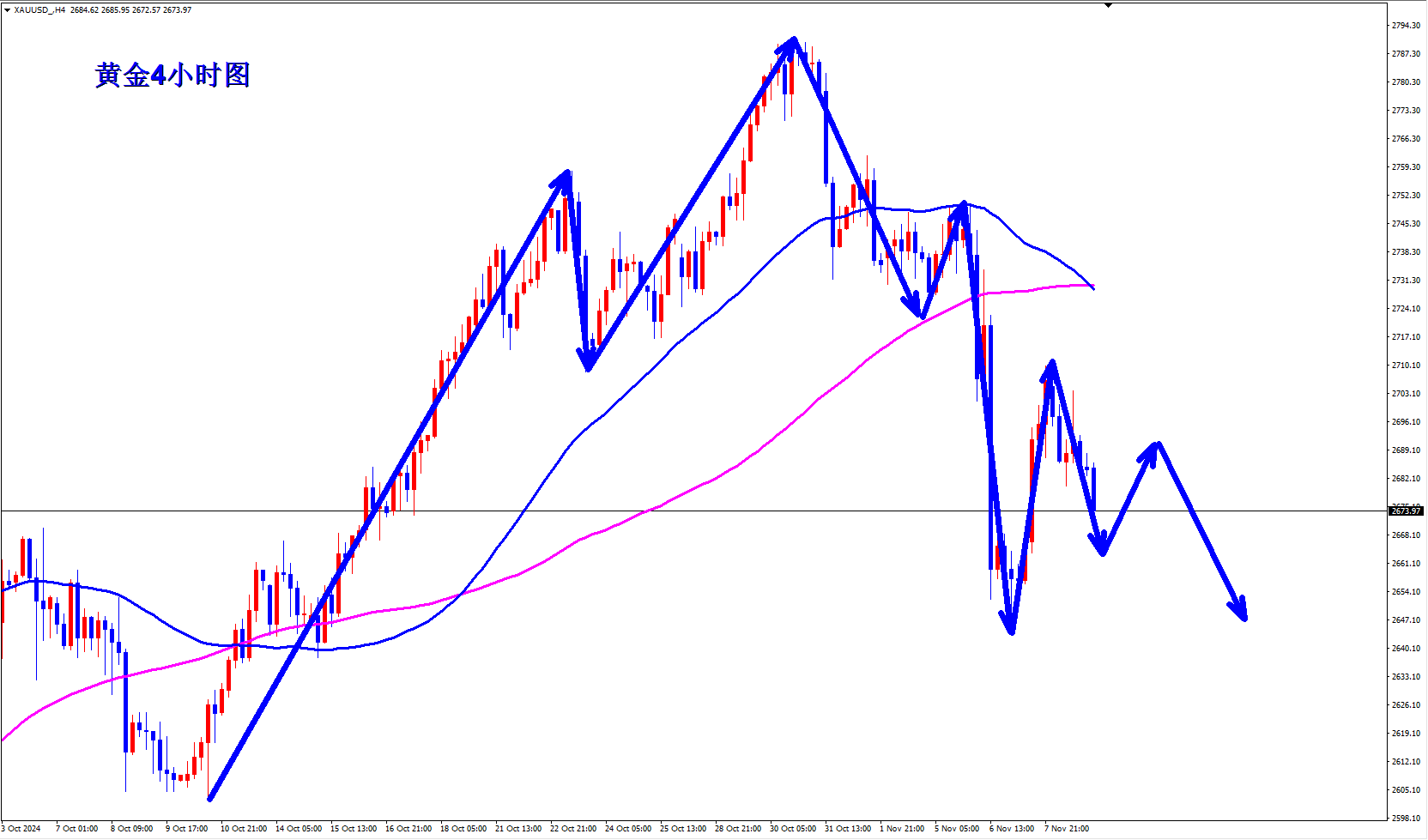 张津镭:美元强势反弹,黄金再受打压 上周周黄金市场因美元走强而遭遇重挫,金价录得五个多月来最大单周跌幅。本周事件不多,除了常规数据外,其他的就是多位美联储官员轮番讲话,其态度将直接影响市场对于美联储后续降息的判断。当然,“特朗普交易”余威仍存,加上中东问题都需中东关注。 周一(11月11日)今日恰逢美国退伍军人节,美国债券市场休市,市场整体交投情绪可能受到一些限制。金价开盘直接从2680开始回落,已经说明了买盘力量的减弱,周评也提到跌破2680后可以直接做空下看,具体还是看局势而言。 可以说,现在行情就是偏回落为主,前期的偏激涨势已然很难了,除非中东在爆大冲突,不然目前的消息面是支撑不起现在