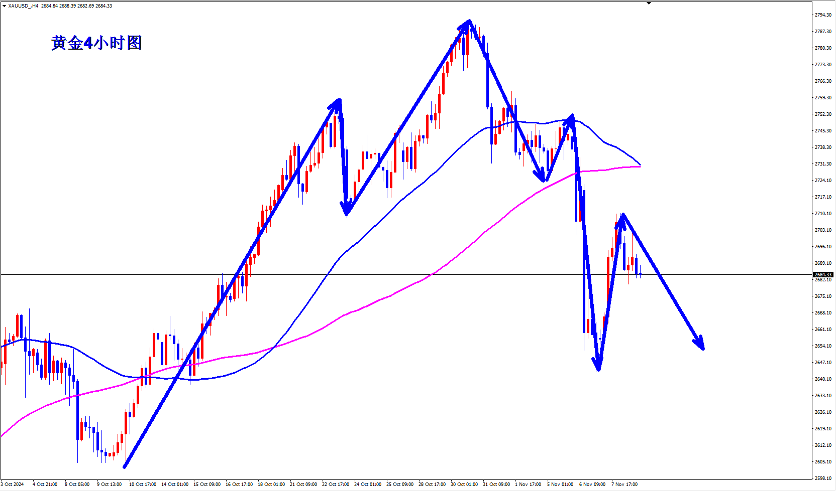 人无远虑,必有近忧,对待行情亦是如此。行情的涨跌并非由个人主观意志所决定,而是充斥着多空双方的激烈搏杀,胜利与失败时刻相伴左右。倘若你仍在盲目交易,整日不是套单便是亏损,那么文承凯想说,你着实失败。误入歧途并不可怕,可怕的是执迷不悟!闲话少叙,行情未动,策略先行,今日分析即刻奉上! 【咨询方式见文章/末尾,可以看到文承凯/咨询/方式】,文承凯将为粉丝提供最大程度的帮助。 周五,尽管美国国债收益率有所下降,然而,由于美元开始复苏,黄金价格出现下跌。此外,特朗普在美国大选中获胜降低了政治风险,这也对黄金价格造成了打击。美国股市延续涨势,并未受到大选恐慌情绪的影响。而大选恐慌情绪曾是推动黄金价格上