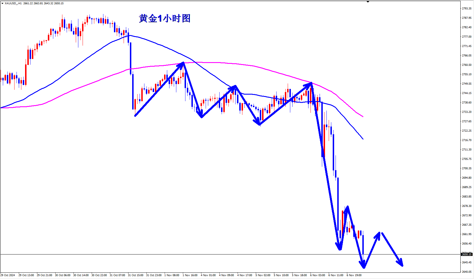 在投资市场有这么一句话,历史不会单纯的重演,但总是惊人的相似,坚持是一种信仰,专注是一种态度!有心的朋友可以点赞,以示鼓励!与高人为伍,你能登上巅峰。授人以鱼不如授人以渔,你的盈利,我的追求。选择比努力更重要。跟对注,赢一次。跟对人,赢一世。投资遇到问题不知如何处理的朋友们可咨询柴华南 黄金隔夜日线大阴收低,美大选的结束,标志着市场消除了一个风险因素,推动了美指走强,从而使黄金大跌,击穿了2700整数关口,形成放量加速,接近100点左右跌幅,调整力度猛烈,属于周线级别调整,力度尚存,所以,不要急于看反弹。早间延续弱势急跌至2641后反弹,目前回到2650上方,今日重点观察亚欧盘是否有弱势延续