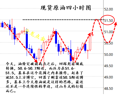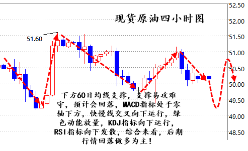 沧龙点金:10.25原油沥青午后操作分析技术指导 行情回顾 周二(10月25日)昨日走势稍显偏弱,早盘冲高51关口未果,随后持续性的震荡回落,晚间更是跌破了50关口至最低49.60美金,不过随后受到日线级别布林通道中轨一线支撑快速反弹,1小时和4小时图上显示反弹力度非常强劲,短线多头再次占据主导,今日亚欧盘操作思路仍然会