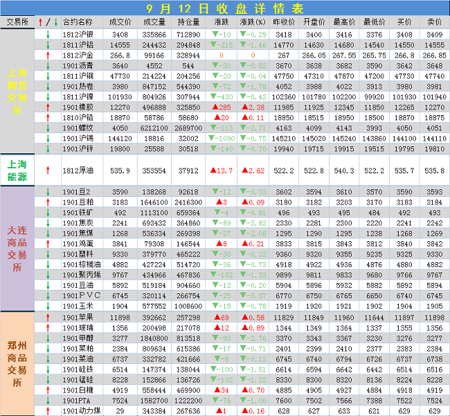 夜里谈金:9.19期货点评 郑油套利需双节后 PTA整体继续下行 今日交易提醒 今日主力点评及策略 铜 市场动态,特朗普政府宣布将于9月24日起对约2,000亿美元中国商品征收10%的关税,并从2019年起将税率提高逾一倍至25%。昨日铜价整体上行,表明市场在关税落地后,利空逐渐释放。回到铜市,今日LME库存下降7775吨至214150吨,目前处于“金九银十”消费旺季,全球显性库存处于低位,截止上周五三大交易所及保税区库存共计95.6万吨,较去年同期下降22.4万吨。今日国内现货升水210-300元/吨,中秋及国庆节前下游备货积极。基建项目密集开工,市场对于消费预期向好。整体来看,