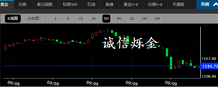 诚信烁金:9.9大宗商品总结汇评 九月加息之剑空悬? 现货黄金周四继续回调,跌破1340关口,美元指数低位反弹至95附近,上周初请人数好于预期提升9月加息预期以及德拉吉发言让市场失望打压金价。小时图看,金价弱势震荡,短期或有进一步下跌动能。 现货黄金周四(9月8日)亚市早盘开于1344.88美元/盎司,最低下探1335.35美元/