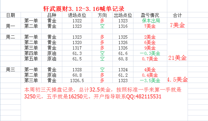 周线收官黄金终极一跌,跌破了周初1313一线低点,截止发文金价最低触及1310一线。目前来看黄金还有进一步下跌的需求,继续下探寻求支撑是黄金应有的姿态。 截止周五最后一单止盈共计喊单14单,其中1单保本,3单止损,10单止盈。共计获利48.5美金,操作一手可获利4850元,5手可获利24250元。只要你有执行力,2018我将带你实