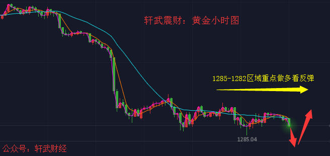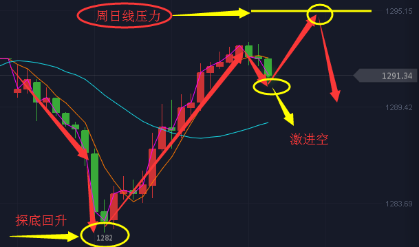 美好的一天得从周一开始,过完了520,相信大家的心情还是是愉悦的。再次回到盘面上来我们发现,黄金又跌了。上周黄金华丽的下跌后,周尾几天一直在震荡,周评中我反复强调,黄金需要这种震荡蓄力过后继续进军空头,听得进去的朋友相信今早也都大胆做空。 欧盘黄金暂时止跌1282 早间黄金开盘继续徘徊1290关口附近,虽然时徘徊