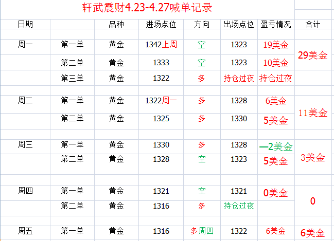 本周行情就交易而言非常给力,上行突破持续抗跌,下行破位不延续,金价本周就是不断的区间震荡,今天涨明天跌一切都似乎是那么的顺其自然。做单盈利上本周依旧获利满满,下周行情主要集中在周尾两天,美联储会议和非农一前一后。卷时我们自然要大赚一笔,一年一度的五一假期就要到了,在此轩武老师提前祝大家假期快乐。 美好