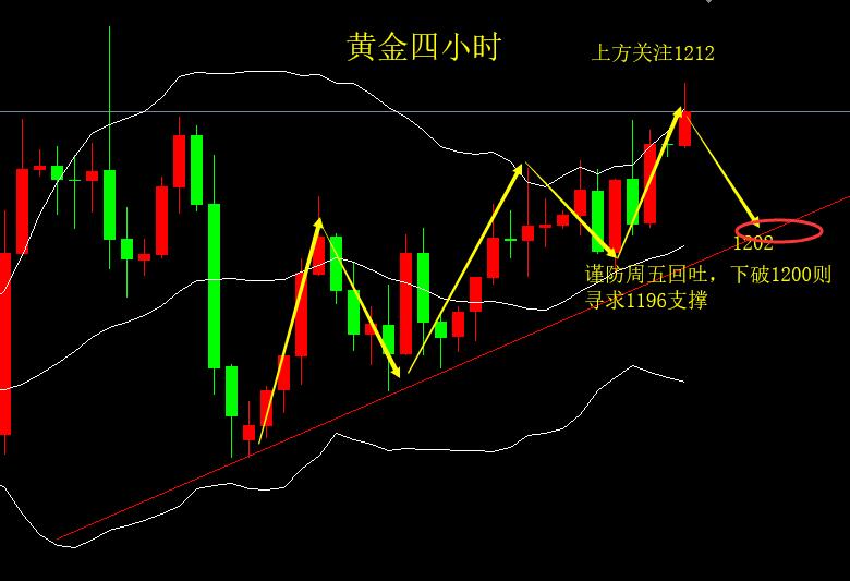 余修镕:9.21本周整体震荡慢涨 周五能否重演大幅回吐? 又到周五,一周的总结,不管是工作还是生活或是投资,都应该有个正当的总结,工作算算业绩,生活算算开销,投资算算盈亏。如果都是良好的,那么恭喜你,如果不是,那就好好想想自己所走的路是否正确了。 9.21(周五)黄金行情分析: 日图收阳顶开了上轨的压力,短线有延续的量能,由于美元的走弱,使得黄金短线图结构依旧偏强,至少今天亚欧盘看好延续,但是空间仍是边走边看,毕竟本周整理了一周,可以继续窄幅震荡收尾,也可以在周尾放量。低多为主,支撑在1202.阻力则在1212看能否突破放量。 4小时缠绕震荡上升站上大周期均线上方,昨日尾盘回踩后整理,今日亚