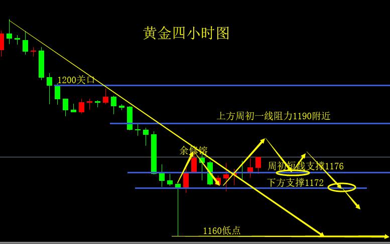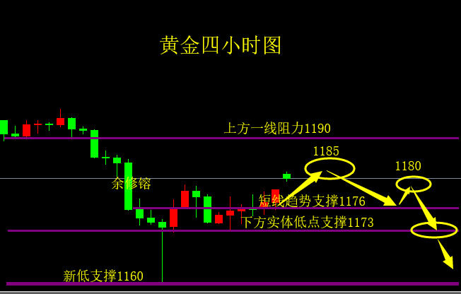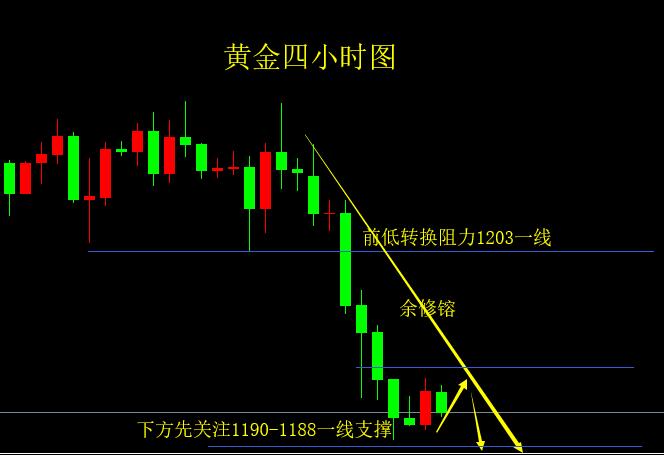 余修镕:8.14 黄金强势破位1200关口 近期必将延续弱势 人生不可能一帆风顺,有成功也有失败,有开心也有失落。如果我们把生活中的起起落落看得太重,那么生活永远都不会轻松,永远都没有欢笑。我们常常徘徊在坚持和放弃之间,举棋不定,其实,不是什么东西都一定要去争取得到的,有些东西暂时得不到也并不会阻碍生活的幸福,而拥有一颗平常心才是最重要的! 8-14(周二)黄金行情分析: 日图大阴破位并收在低位。暂时不担心止跌回升,今日还会伴随惯性的下探,日图没有出现快速的下探回升K线,暂时不宜再去看多,而千二心理关口实质性破位后,会引发短线抛盘加重。日内短线围绕1200下方反弹做空即可。 短线图:4小