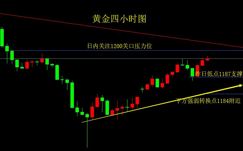 余修镕:8.22 黄金短线震荡上升 今日仍关注1200关口得失 保持愉快不急不躁:如果一个交易者不能保持快乐愉悦的心情,那么无论自认为有多了不起,最终的结果肯定是失败的。往往失败的影响会波及情绪以及思维能力,如果一个身心不平衡的人从事投资,是非常危险的事。因此,交易时一定要保持冷静,不急不躁,只有轻松交易、快乐投资才能轻松获利。 8-22(周三)黄金行情分析: 黄金周二下探回升收盘,亚盘开盘延续慢涨,刷新1196高点后,欧盘承压回落,美盘确认1187.50低点支撑回稳修正,尾备时段再受美指弱势下行,提振金价反弹收盘,今日开盘进一步小幅刷新高点,节奏缓慢震荡上升,单日的空间相对较小。但短线还是