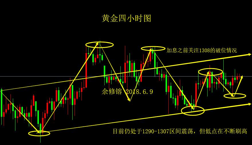 余修镕:6.9加息后黄金多头或将再次崛起 下周行情分析 本周的行情结束了,不论结果是盈利还是亏损,给自己放个假,不要忘记除了投资你还有家人要陪,还有生活要过,投资不是你生活的全部,有套单的朋友也不要周末一直纠结于套单,无论你怎样纠结,周一开盘行情是涨是跌都不是我们可以左右的,与其这个周末痛苦的度过,影响到工作生活影响到你下周的投资,不如给自己的身心都放个假,调整好心态,迎接下周的行情! 国际消息面: 随着进入6月,最大的暴走事件就是美联储是否在6月加息。从之前的表示来看,美联储加息已经进入到中期,虽然一致表态鹰派,但市场预期透支也是明显。所以,加息之前,黄金承压,低位整理为主。加息之后,黄
