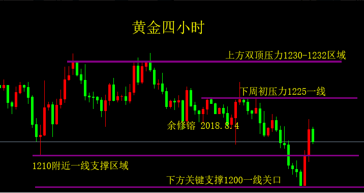 余修镕:8.4周评 本周非农之夜大获全胜 黄金下周行情预解析 时间过得真快,转眼又到周末,一周的交易中是否获得了自己满意的收益,有没有完成自己的规划呢?有人欢喜有人愁,有些人赢得盆满钵满,当然也有人在一年的交易亏损严重,市场是残酷的,百分之二十的人赚钱,百分之八十的人亏钱,二八定律同样适用于这个市场,不管你现在的情况如何,不要去纠结过去的对与错,要向前看。 本周回顾: 本周黄金一直承压于1230之下运行,虽然有过一次试探但始终都未能突破,离1230的压力却渐行渐远,下跌趋势之中,黄金一直保持在低位震荡,但并非说黄金多头已经无力上扬,黄金目前大趋势空头占主导是没有错,但黄金不管是日线级别也好还