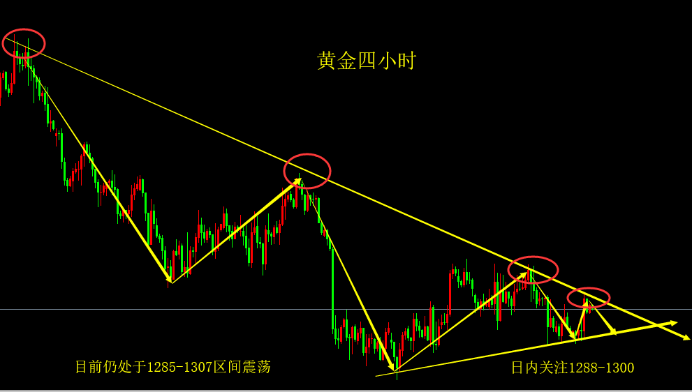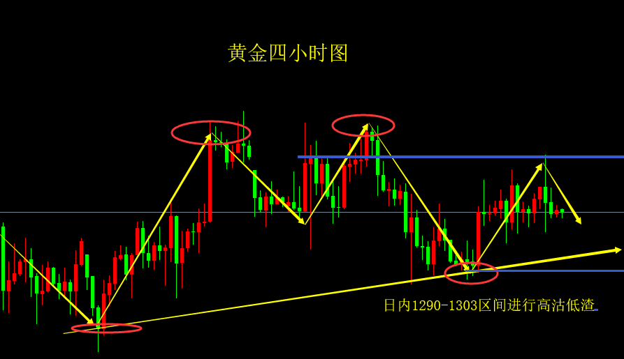 余修镕:黄金周官收尾延续窄幅震荡 小空间一样有利可图 我们不要总是站在旁边羡慕他人成功,其实成功一直都在你身边。只要你还有生命,还有能创造奇迹的双手和大脑,就没有理由当过客,更没有理由去抱怨失败。聪明的人,就会一味向前看,而智慧人,事事向后看;所有聪明人,是战胜别人的人;而智慧人,是战胜自己的人。修心要当以净心为要,投资要当用慧眼远眺,不要眼界的格局太小。 黄金周四延续震荡格调未改,本周已经是连续第四个交易日的窄幅震荡,延续了上周的拉锯,只是区间由下移至1290-1303之间收敛震荡,昨日美元延续下跌,提振黄金冲高,黄金试探1302.80高点承压快速回落,延续性有限,整体的区间基本上在昨日日
