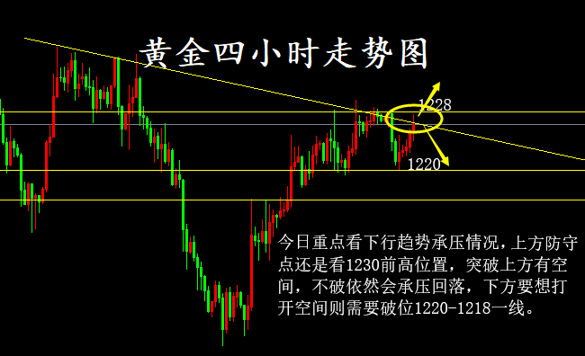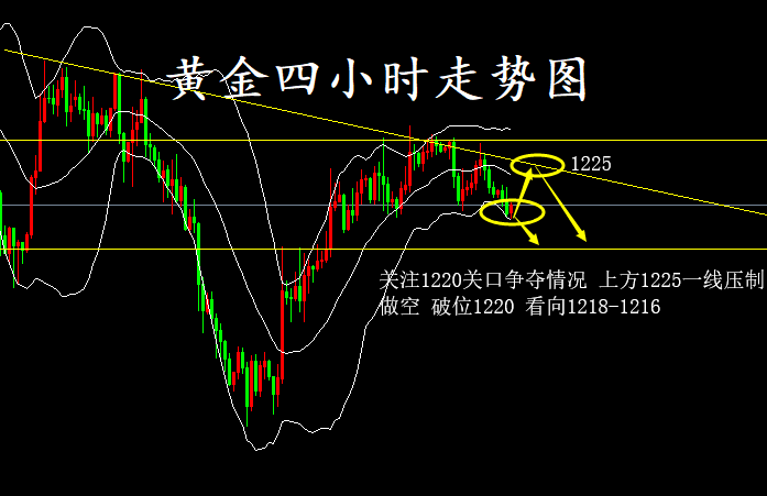 余修镕:11.28黄金反弹无力 1220防守现价1214可先空 从不相信手掌的纹路,只相信手指紧握的力量。成功不可能是急功近利的模仿,梦想更不可能是人云亦云的跟随。在交易中,真正能有所收获的人,都有着对错误的不断总结、对目标的坚定持有,相信自己的判断,却又并不固执,只有如此,才能在日复一日的盘面中找到正确的路。 11.28(周三)黄金行情分析: 昨日黄金市场延续了前日倒锤头回落信号的过程回落,行情早盘小幅高开在1222.3的位置后行情先拉升给出1225.3的位置后行情卡似乎回落过程,盘中跌破前一周低点后最低给到了1211.6的位置后行情整理,日线最终收线在了1214.5的位置后行情以一根上下