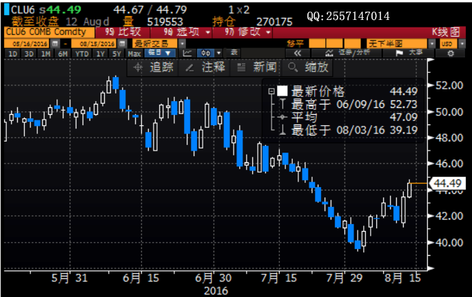 郭俞妍:油价劲升6%,下周一8月15日现货原油、白银预测 原油篇 【三大月报出炉,OPEC喊话助油价劲升逾6%】 本周国际油价劲升逾6%,延续上涨反弹走势,美原油9月期货创逾三周高点至44.78美元/桶,布伦特原油10月期货最高触及47.25美元/桶,多个产油国呼吁冻产,尤其是沙特能源部长表示9月份OPEC和非OPEC国家将会晤商讨提振油