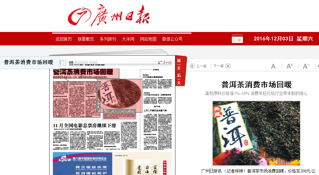 据昨日2016.12.3广州日报报道普洱茶市场消费回暖,特别在原材料价格这一块,200元/公斤以上的中高档原料涨幅5%10%。 在刚刚结束的为期5天的茶叶市场的风向标广州茶博会上,有茶商向日报记者透露今年的行情比去年有明显升温,市场消费力明显提升合和昌茶业有限公司董事长钟广林认为促成这种现象的最主要原因是从今年5月起,