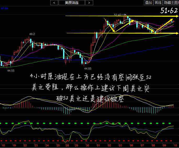 一周的行情已经走完,我们要珍惜下周行情涨跌,那么从周末我们就得关注下周重点消息面和技术面分析行情走势。重点关注事件:下周美联储加息! 【原油简单行情分析及操作建议】 周五尾盘4小时原油上方已经没有空间涨至52美元受阻,直接在高位51.5美元震荡,那么下周操作上孟可瑶建议美元突破52美元还是建议做空。 策略一:上