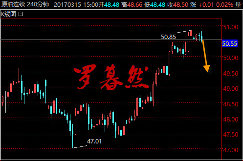 由于近期美元表现疲弱,兼之英国遭遇恐怖袭击推升避险情绪,金价创逾三周新高。上周五特朗普的新医保方案胎死腹中使得弱势美元雪上加霜,目前5月份的加息概率为13.3%,6月份的加息概率为50.2%。黄金上方压力关注1260,下方支撑看1250. 黄金操作建议 1250-1260附近做空,目标1255-1253,止损1264 原油在上周急跌后迅速小幅反