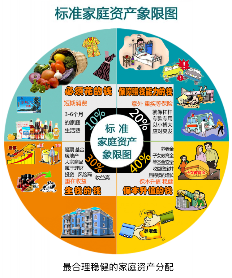 上图大概能表示出中国标准家庭资产分配的一个情况,为何说是标准,笔者简单阐述一下:由于国家经济的逐步发展,老百姓生活水品的不断提高,从综合来说,上图所表现的属于现阶段中国家庭资产分配的合理标准。 图中所示的4大块账目,我们分别来阐述 一、必须花的钱 第一个账户是日常开销账户,也就是要花的钱,一般占家庭资产