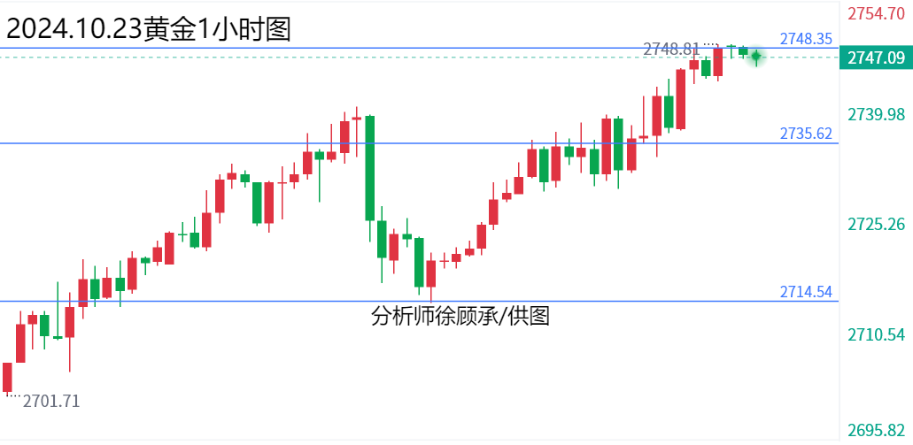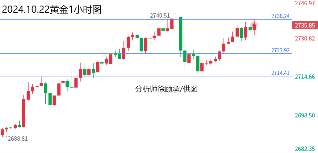 周二(10月22)纽约尾盘,现货黄金上涨1.07%,报2748.88美元/盎司,北京时间04:57刷新历史高位至2749.03美元。现货白银涨3.11%,报34.8590美元/盎司,继续逼近2012年10月1日顶部35.3650美元。 昨日早盘开盘触及2718后,亚盘就一路保持上涨,欧盘时段反弹到了周一美盘的高点2439附近,从欧盘时段就一次围绕着2740-2730区域来回震荡,美盘开盘后短暂维持了欧盘的震荡,都是慢跌,然后快速拉升,给多头强势的假象,追多位置把握不好是比较头疼的,快临近12小时收线时段,行情一度站稳2744之上,又一次强势多头迹象,可行情却收线到了2736的位置,显然是有一