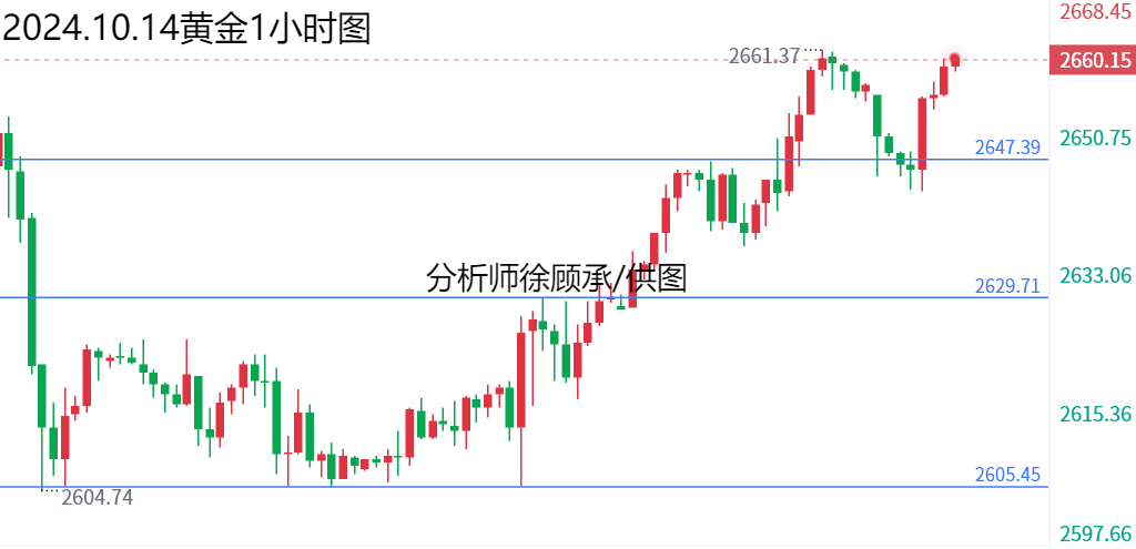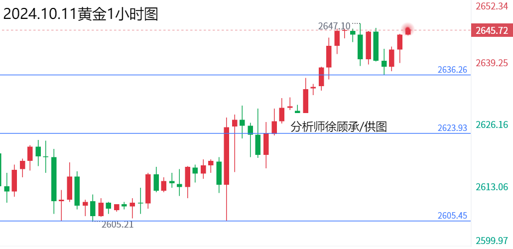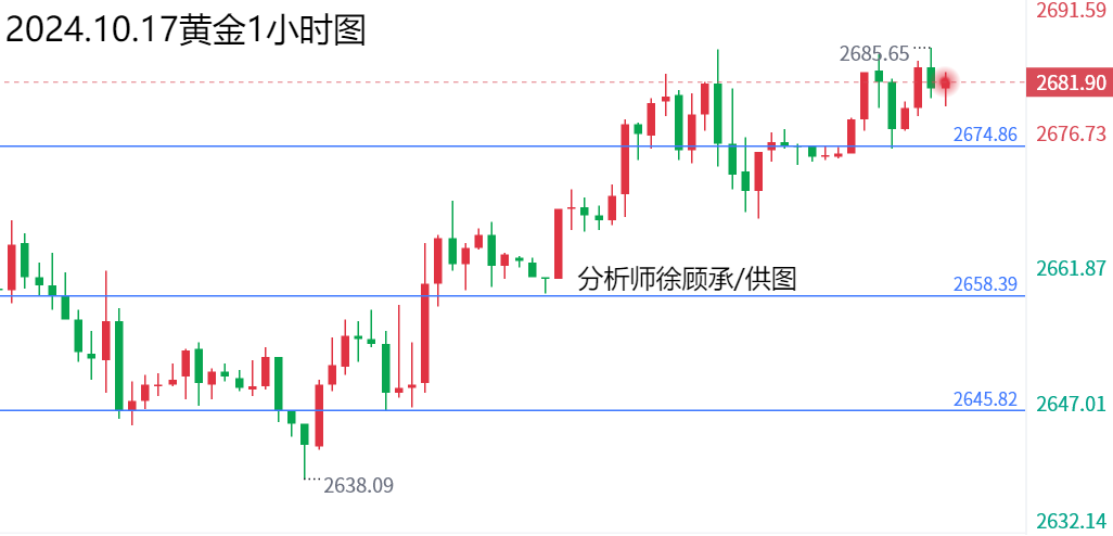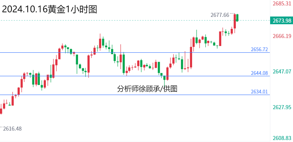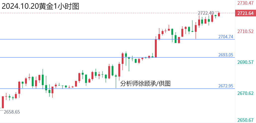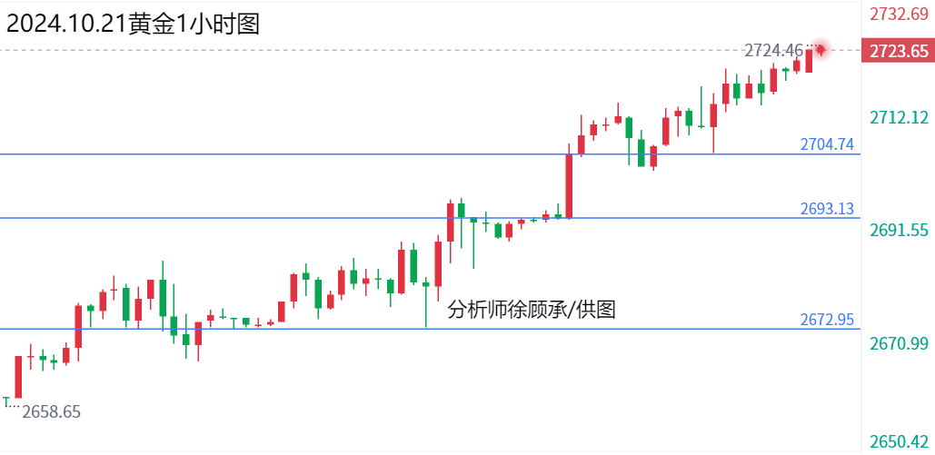 文/徐顾承: 上周五黄金收盘报在2721美元,受全球不确定性加剧和货币宽松预期推动,金价创历史新高,首次突破2700美元。在地缘局势和经济形势动荡的背景下,投资者纷纷购买黄金,避险需求激增。随着美联储预计将在11月份降息,黄金的无收益吸引力增强,支撑价格进一步上涨。徐顾承表示上周黄金大涨,除周一外其他四个交易日全部收阳,周四突破历史新高2685,周五加速上涨,周线以大阳线收盘2720以上。周一(10月21日)亚市早盘,现货黄金延续上升走势,金价刚刚触及2724.51美元/盎司,创下历史新高。 美国大选与宽松货币政策的预期也进一步推动黄金价格涨势。以色列及其敌人哈马斯和真主党仍扬言持续对战,地
