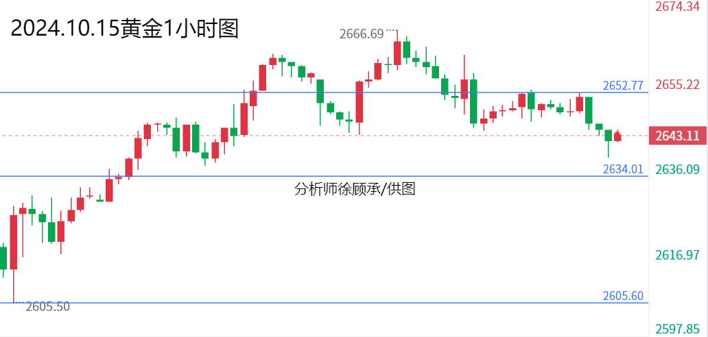 文/徐顾承: 周一美元指数触及10周高点,延续了其长达数周的看涨走势,最终收涨0.28%,报103.20。美指重归三角格局内交易,技术指标暗示其将受阻。徐顾承认为只要通胀回落势头持续,强劲的经济活动数据不会阻止美联储持续降息。预计美国9月零售销售数据环比增长0.4%,劳动力市场仍具韧性,就业增长率不会受到飓风海伦妮的影响。 周二(10月15日)亚市盘中,黄金短线突然快速下滑,金价刚刚跌至2642美元/盎司附近,美元在本周初保持了积极的势头。现货黄金周一承受温和的看空压力,受中东消息影响,令黄金的避险买盘受到打压。最新有消息指出,伊朗通过秘密管道向以色列传递信息,表示若以色列的报复行动“有限度