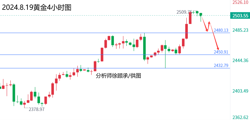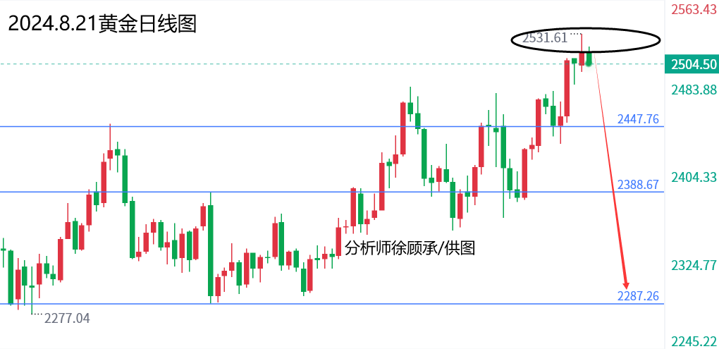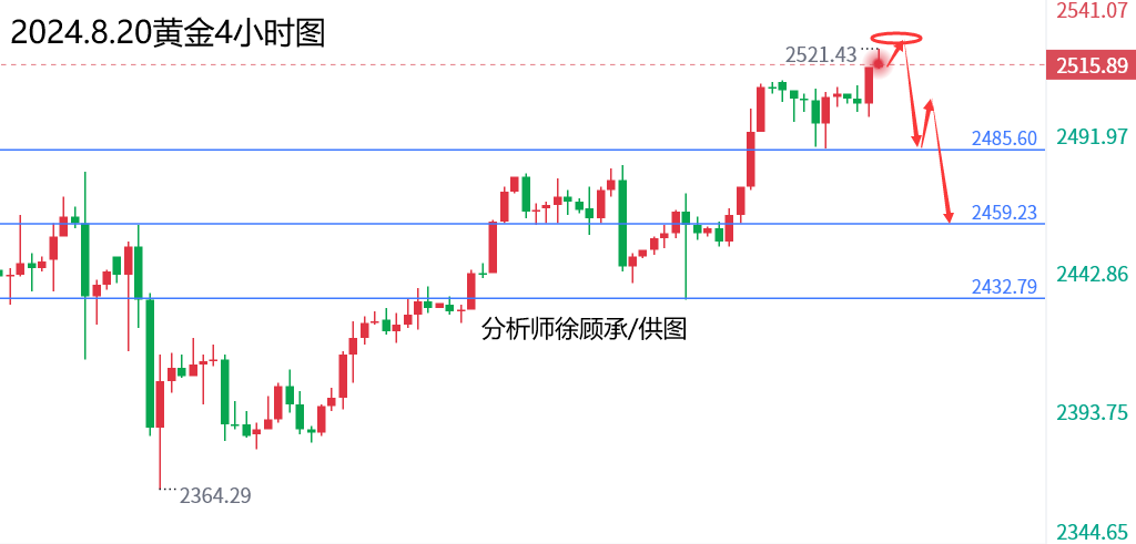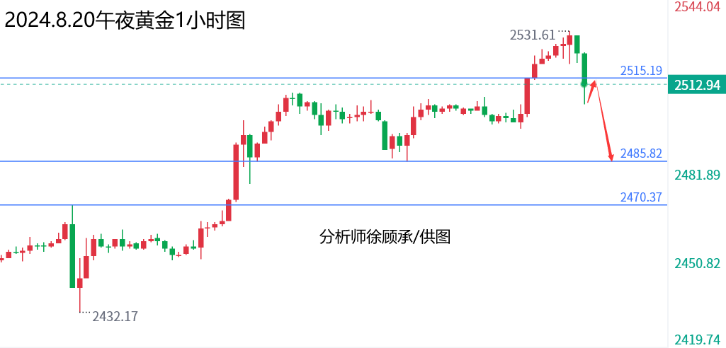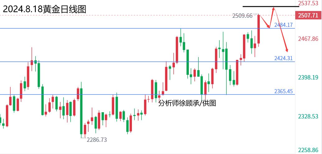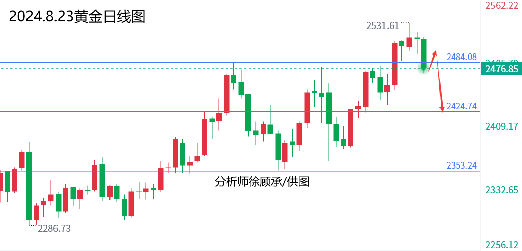 文/徐顾承: 昨天黄金上涨,主要是美国非农数据下修影响,高盛预期100万,最终结果下修81.8万,对黄金构成利多支撑。今天全球央行年会开始,关注美联储主席鲍威尔讲话!今天晚间美国初请失业金数据符合预期,标普制造业数据相对较差,刚刚公布的成屋数据5个月来首次增长数据多空都有; 就在刚刚黄金连续向下破位2493美元和日线顶底转换2480区域,空头蠢蠢欲动,不排除随时跳水,上周五大阳线低点2450将随时破位迎来中线下跌!理论上没有重大利多消息的话2532就是日线级别的顶了,接下来就看美联储主席鲍威尔如何表演了! 毕竟市场预期鲍威尔非常鸽派,9月降息几乎板上钉钉;一旦和市场预期的那样,那么黄金将迎来