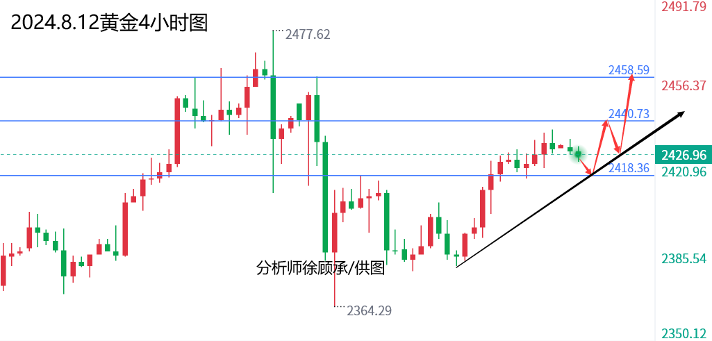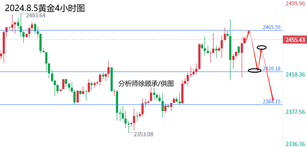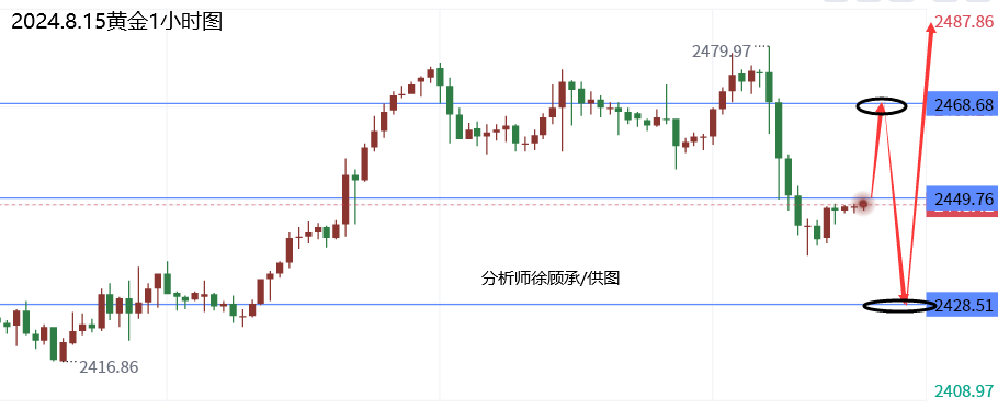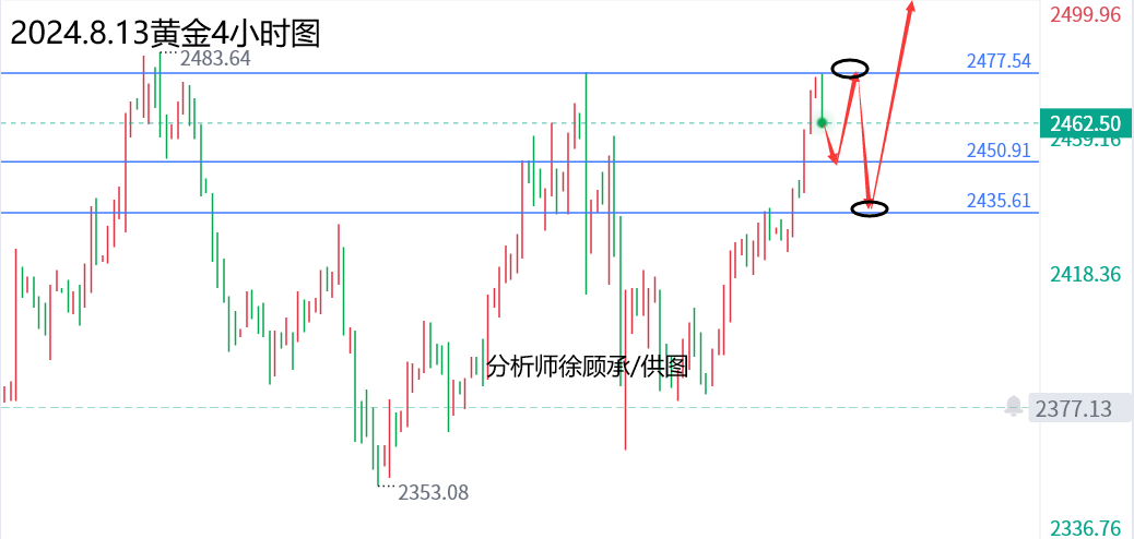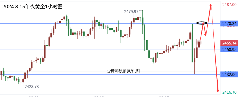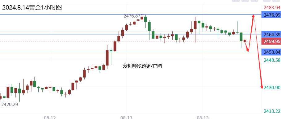 文/徐顾承: 基本面,昨日的基本面美国7月零售销售月率录得1%,远超预期,上周初请人数略低于预期,降至7月以来最低水平,交易员削减美联储降息预期,现对2024年降息幅度的定价不足100个基点。但随后美国的房产指数大幅下降,所以尾盘非美和金银市场有所拉升,地缘局势方面俄乌冲突和中东地区的冲突仍在继续,特别是中东地区更是警报频传,避险情绪下黄金市场得到进一步的巩固拉升,今日的基本面主要看20:30的美国7月新屋开工总数年化和美国7月营建许可总数,稍晚看22:00的美国8月一年期通胀率预期初值和美国8月密歇根大学消费者信心指数初值。 黄金:昨天黄金的行情我们基本是完美的拿到,给大家说的2465-2