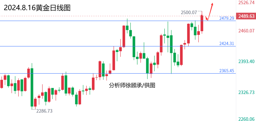 文/徐顾承: 金价再创历史新高!黄金上涨说明经济不景气,各行各业进入萧条,货币贬值,美元信任崩塌引发金融危机,通胀压力影响货币购买力,反过来说如果金价下跌,意味着经济繁荣,可能有更好的投资方式,会大量抛售变现。目前来说,只有黄金是最能抗通货膨胀。 黄金晚间强势拉升的走势目前来看已经暂时告一段落,黄金没能站上2500,只是触及一下,盘面上看2500整数关口的抛压有些强,短线回撤属于正常,黄金还会继续向下调整一定空间,短线操作可以小空,但今晚我们已经不打算在开仓,留着机会给下周! 目前盘面趋势仍是保持强势,后期调整结束还是要做多,首要点位主要要是参照2480-2485这个区间,因为这个区间前期多