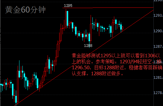 何波军:11.28黄金一旦未能涨破,则将延续过山车行情 行情回顾,昨日市场买盘白银,银价获得动力后,支撑金价再次站上90关口,日内金价徘徊在1290-1292一线,白银日内涨幅达到1%,而黄金只有0.3%,晚间在没有消息面影响的情况下,市场再次买盘,不过目标则放于黄金,黄金涨幅临近1%,而白银则1.3%左右,且黄金扩大涨幅企稳1