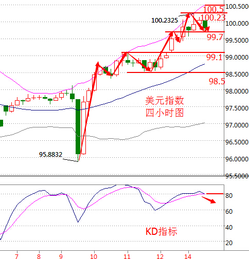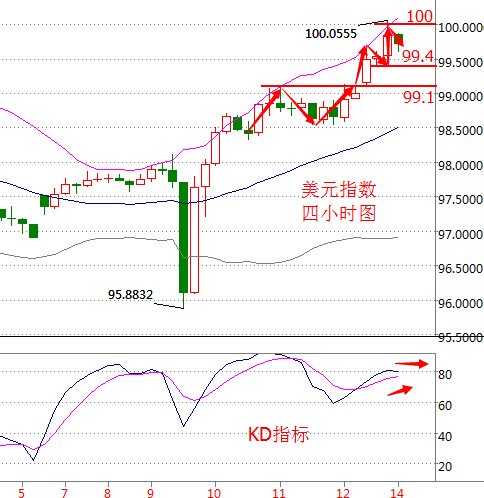 何波军:美元指数强势拿下100大关.基本面强劲回落就是多 基本面分析: 美元指数周一一举突破100大关,劲升至去年12月以来高位100.24,美元兑一篮子主要货币升至11个高位,受美国债券收益率升势及特朗普胜选带动的通胀预期推动,美元重拾升势。 近期美元涨势的中心是预期特朗普执政下不但会增加支出,而且还会对贸易施行更多