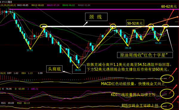 后市原油看到60美元,还有近8美元空间 晚间注意51.57美元一线的支撑,这里是日内黄金分割回踩点0.618的位置,也是60分钟图布林带中轨的支撑,油价在没有跌破这一线之前,不能轻易言空!那么现在行情处于回调阶段,所以说现在做空是不理智的选择,若行情在51.57这一线支撑,那么行情必定是会上涨到55-60美元附近。 若有在52.