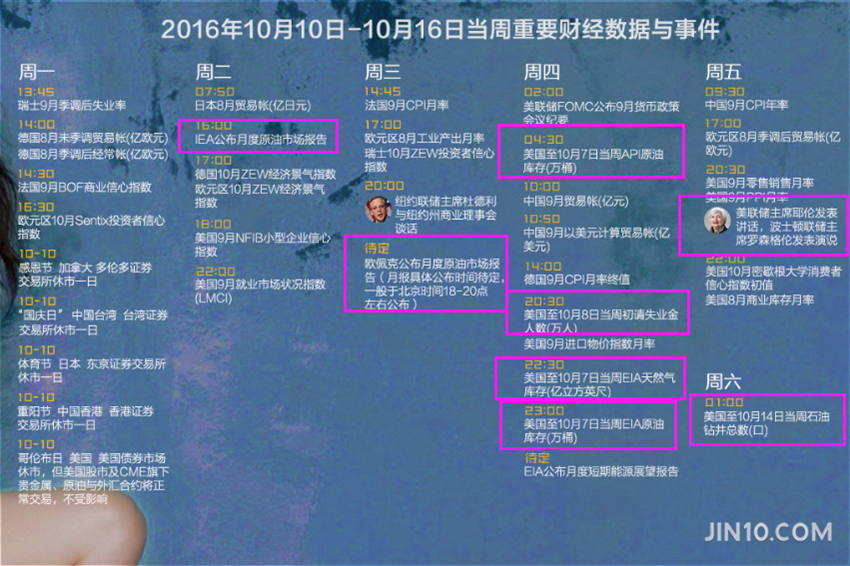 导语:上周恰逢国庆假期数据超级周,非农给人的刺激似乎意犹未尽,那么本周将继续发力。 本周还将迎来油市超级周,OPEC及非OPEC产油国计划于10月8-13日召开非正式会议,讨论减产协议的实施情况;此外,IEA、EIA、OPEC均将发布月报,原油价格能否继续维持如此良好的涨势,本周将会确定,不过就目前原油市场而言,从来都是多