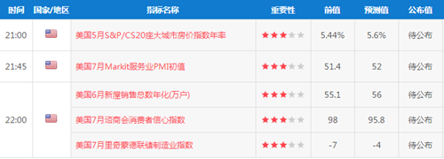 鈊可点金7.26重点关注及原油白银天然气操作建议 今日重点关注的财经数据与事件2016年7月26日周二 1、21:00美国5月SP/CS20座大城市房价指数年率 2、21:45美国7月Markit服务业PMI初值 3、22:00美国6月新屋销售总数年化、美国7月谘商会消费者信心指数 4、22:00美国7月里奇蒙德联储制造业指数 5、次日04:30美国至7月22日当周AP