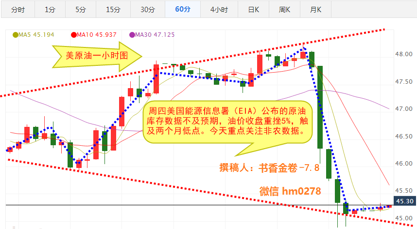 文/书香金卷撰写/微信hm0278 基本面: 美国WTI 8月原油期货价格周一(7月11日)收盘下跌0.86美元,跌幅1.89%,报44.55美元/桶,油价周一下跌触及两个月低位,OPEC成员国原油产量升至近8年高位;同时,上周供应过剩忧虑导致油价跌穿一关键技术支撑水准后,卖盘持续。与此同时,ICE布伦特9月原油期货价格收盘下跌0.71美元,跌幅1