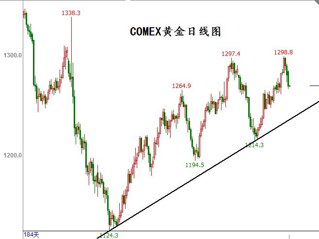 贵金属类(黄金) 周二(6月13)黄金结束连续4日下跌,较前日收盘小幅上涨。纽约商品交易所8月份交割的黄金期货(COMEX)价格下上涨0.8美元或0.05%,收盘价1278.5美元/盎司。 盘中亚欧时段黄金延续弱势下跌,美盘开启后短线下挫,创下至5月29号以来最低价1260.5美元/盎司。随着美元跌破97关口继续走跌,金价逆转之前跌势,