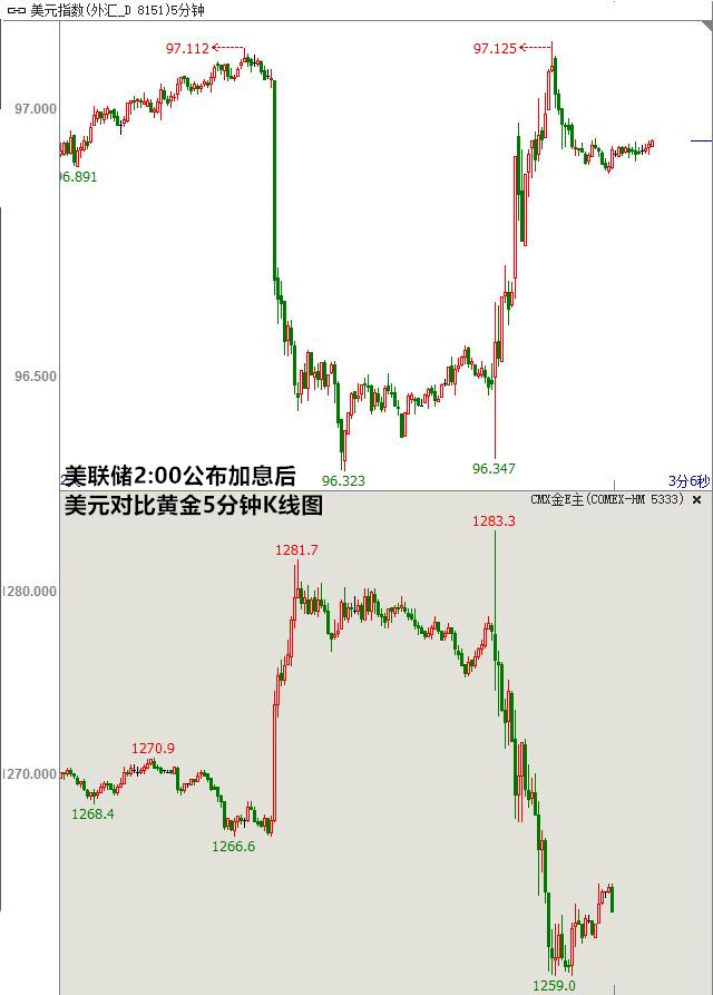 贵金属类(黄金) 周四(6月15日)凌晨2:00,美联储宣布加息25个基点,联邦基金利率从0.75%~1%调升到1%~1.25%,并公布了明确的缩表细节。决议宣布后,美指,黄金走势瞬间逆转:美元指数震荡上涨,一度攀升至97关口上方,黄金则冲高回落,暴跌至1259美元。 美元/黄金5分钟K线对比图 周三(6月14)黄金收盘下跌,纽约商品交