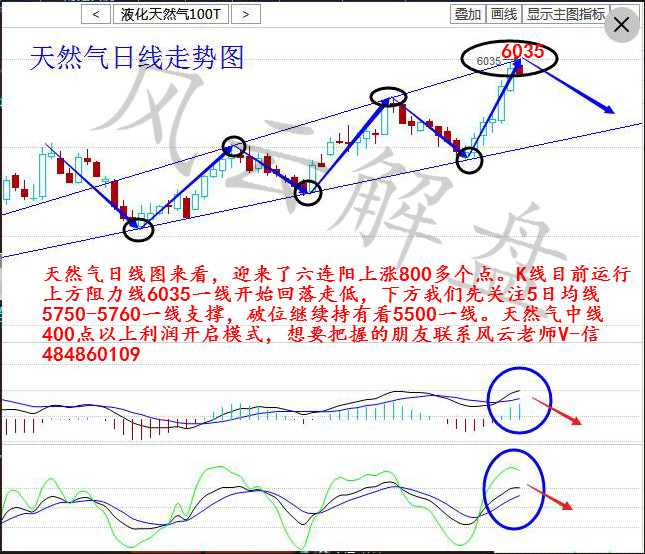 天然气日线图分析,迎来六连阳上涨800多点。K线目前运行上方阻力线6035一线开始回落走低,下方我们先关注5日均线5750-5760一线支撑,破位继续持有看5500一线。天然气中线400点以上利润开启模式,想要把握机会的朋友联系风云老师。 天然气昨日单边240点的波动,你是否把握到了? 行情每天都有,你缺少的不是机会,而是缺少把