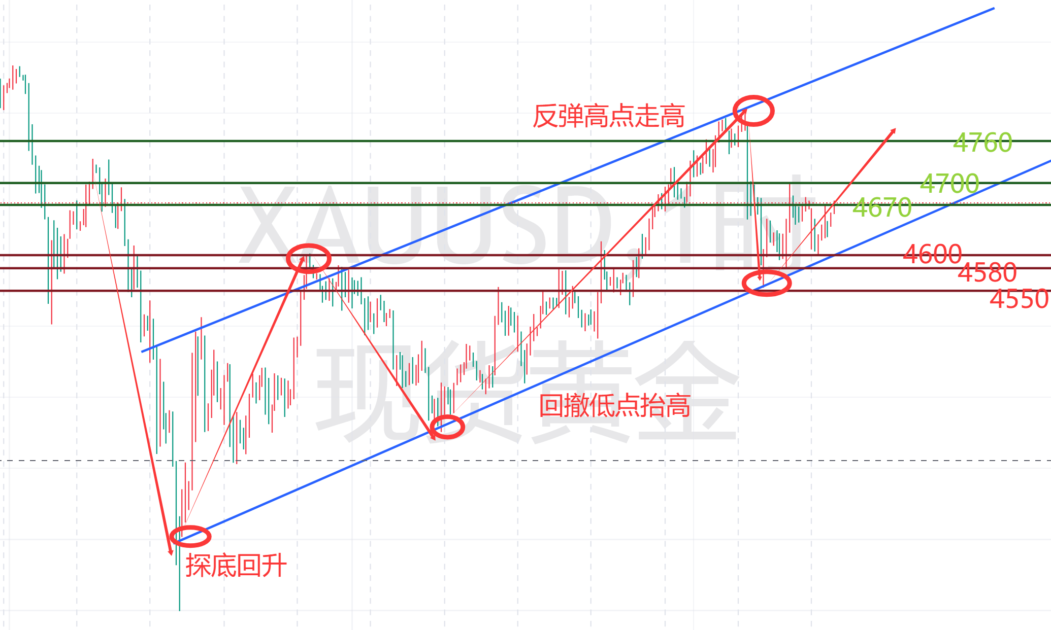 早盘探底回升后维持高位震荡,很多朋友问当下是追多还是做空,下面周睿金简单从盘面分享个人观点。 首先从周k级别来看,近期周线收出连续企稳阳线,呈现低点不断抬高、高点逐步上移的标准多头趋势结构,K线稳稳依托短期趋势线运行,没有出现长上影见顶K线、乌云盖顶等反转形态,中期多头格局完全没有被破坏。 切换到日线级别,黄金此前连阳反弹冲高后,近期在高位连续收出小阴小阳、十字星K线,这是典型的上涨滞涨信号,说明多头动能有所衰减,多空双方在4500上方进入分歧博弈阶段,没有延续单边强势上涨。 短线4小时级别,价格站上布林中轨,上轨压制4600一线,日内站稳4600一线行情走强,打破近期的一个震荡区间,日内