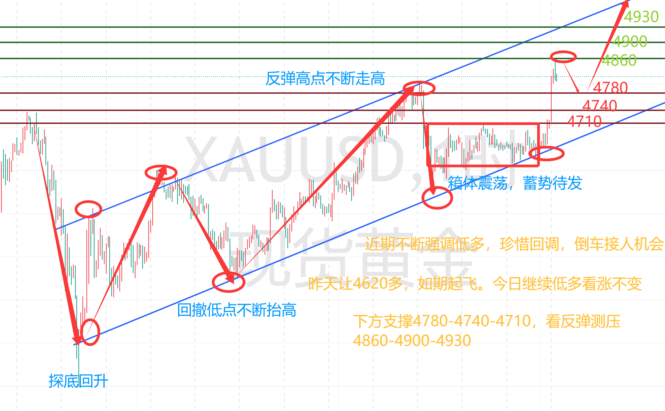 黄金昨天跳空低开,先是回撤4600一线止跌,周睿金给到大家4600低多也是如期上车,最高反弹4706一线冲高受阻,多单也是能吃下100点利润,实属躺赢!日k收一根阳十字星,依旧受压布林中轨压制当中,MACD多头量能持续放量当中。 短线4小时级别,金价同样受压布林中轨压制,RSI拐头向上,KDJ走平走缓,MACD空头量能在放量当中,冲高后,指标依旧在走修复。小时图金价位于中轨跟下轨之间震荡修复,KDJ金叉向上,行情整体偏震荡,日内操作上,依旧采取低多为主的思路。 价格依旧还处于上升的通道当中,自从4100探底回升以来。日内关注下方支撑4620-4600-4580三个位置,低多围绕这里参与