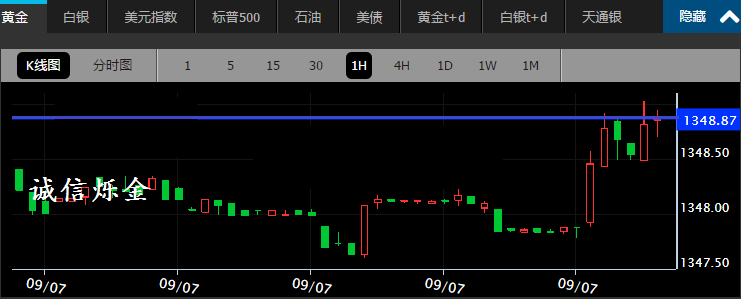 诚信烁金:9.9大宗商品总结汇评 九月加息之剑空悬? 现货黄金周四继续回调,跌破1340关口,美元指数低位反弹至95附近,上周初请人数好于预期提升9月加息预期以及德拉吉发言让市场失望打压金价。小时图看,金价弱势震荡,短期或有进一步下跌动能。 现货黄金周四(9月8日)亚市早盘开于1344.88美元/盎司,最低下探1335.35美元/盎