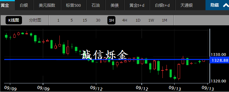 诚信烁金:9.13大宗商品总结汇评,多头能否把持住? 现货黄金周一微幅收跌,美元指数承压下跌,美联储理事发言偏鸽派打压市场对9月加息的预期。4小时图看,金价有企稳迹象,在缺乏更多消息刺激下,短线或继续围绕1330-1320区间震荡,等待方向。 现货黄金周一(9月12日)亚市早盘开于1327.60美元/盎司,最低下探1320.70美元/盎司