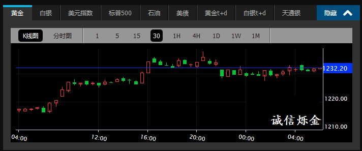 诚信烁金:8.15大宗商品汇评,黄金强势收涨15美元 国际现货黄金周二(4月5日)反弹1%至1230上方。投资者重估资产价格,避险资产全面反弹,欧美股市大跌,金价从近2月低点企稳反弹。 现货黄金亚市早盘开于1215.40美元/盎司后小幅上涨但随即下跌,录得日内低点1214.80美元后,盘中现直线拉升,不断刷新前高。欧市短暂盘整后延续
