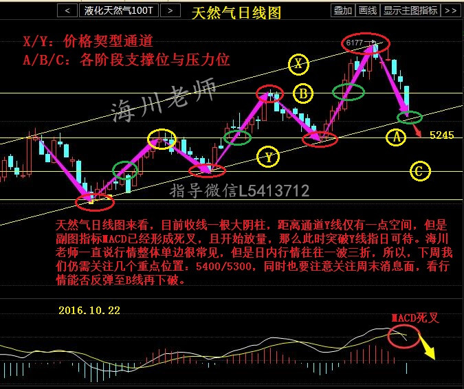 天然气方面 上午好,昨天天然气的一波暴跌回补了本周的高开:从日线上看,昨日收取一根大阴柱,K线运行在布林中轨下方,受到60日均线的支撑,MACD绿色能量柱持续放量,而从四小时图来看,K线在布林下轨上,运行在均线系统下方,MACD绿色能量柱放量,日间操作高空为主; 10.26天然气操作策略 1、上方关注5390一线的压制,不