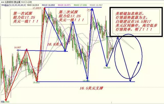 美联储加息,这可能是对金银的打击是最致命的,且耶伦强调说加息三次,这无疑暗示美国经济复苏强劲,美元得到较强支撑,筑底有可能延后。当然15.8是不是底部,还需要时间来进行多次试探才行,一次性的触底反弹我没见过,唯一一次也就是英国脱欧的那一天,所以下周将会反复测试底部支撑,要么触底反弹慢牛上涨,要么进一步下