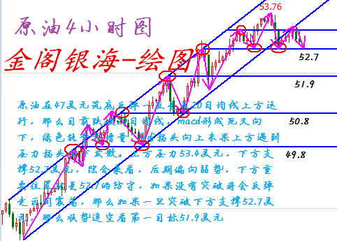 各位投资朋友大家晚上好,我是分析师金阁,上周的行情周评里面已经总结过了,现在就不多做说明。说一下今天的行情,周评的观点还是不变,思路回落进多,下午五点还有朋友问我原油怎么做,自然是做多,目前已经获利最高到达52.99,现在首先要关注53美元的压力,突破看涨无疑,三重底形态中线可以继续看到55美元。 最糟糕的感