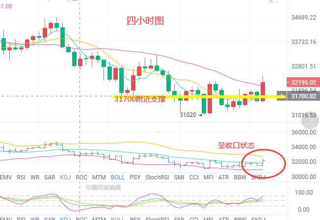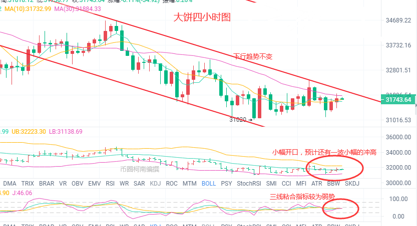 昨日大饼早间冲高31463一线后瞬速回落,日内最低触及31108一线,日内给出做空策略完美符合行情走势,晚间更新策略给出32000-32300进场做空策略也完美符合行情走势,早间冲高最高触及31943一线后继续回落至31420一线,目前技术面来看,日线均线指标整体还是呈现空头形态,币价运行在中下轨之间,布林带成小幅开口状态,随机指标KDJ三线表现的较为弱势,四小时来看,布林带收口后再小幅开口,币价昨日回落触及下轨位置开始向上运行,目前在上轨下方,随机指标KDJ三线表现较为弱势,综合来看,比较短期上涨动能和下跌力度均不足,但大趋势看空不变,所以日内操作柯南还是建议反弹做空为主,压力位置不变建议