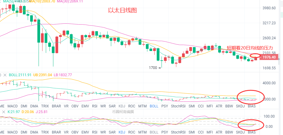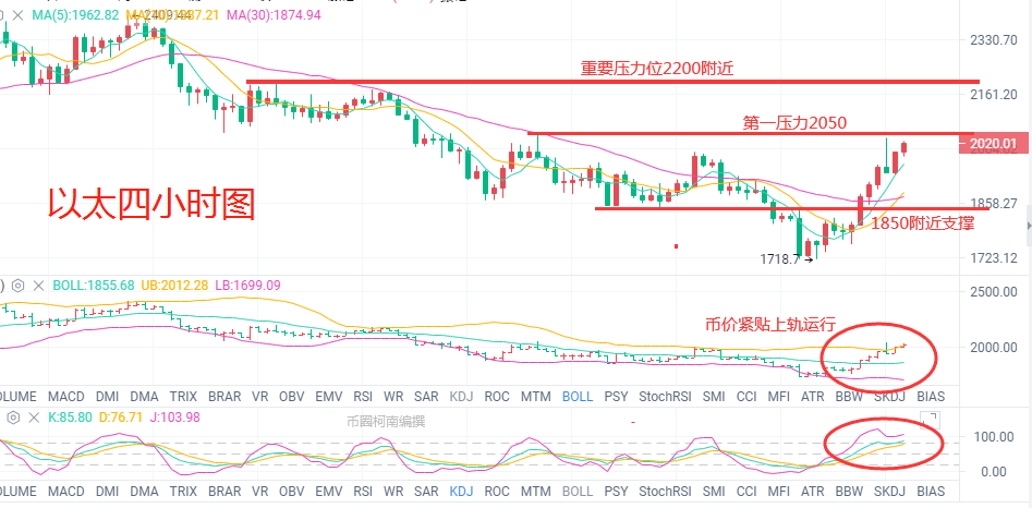 笔者 以太的反弹在我的意料之中,本周的思路关注过的朋友相必也不用我多说,一直强调技术面的指标有强烈的反弹修复需求。目前从技术面来看,日线收取一根大阳柱,昨日的反弹受阻MA30,布林带三轨运行较为平缓中轨明显向下,昨日强势反弹也是受阻布林中轨2050附近,随机指标KDJ三线金叉向上;四小时来看,均线指标整体向上呈现多头,布林带大幅开口且币价紧贴上轨位置,随机指标KDJ三线金叉向上发散,但目前J线有明显放缓的迹象,综合技术盘面来看,短期多头发力较为明显,但也有放缓的迹象,所以日内操作柯南建议回落做多为主,但大趋势的空头还没有完全反转也要谨慎空头发力,日内先关注昨日反弹受阻的位置2050一线,如破