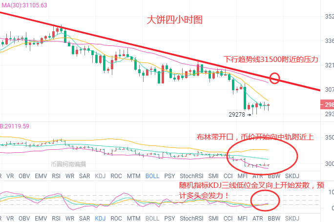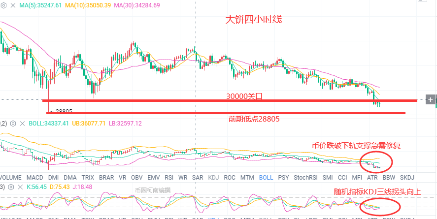 大饼盘中继续走弱,最低触及29278一线,自下破30000大关日内基本没有反弹的空间,早间也说过强势下破30000关口肯定会到达29500附近,日内一直在30000下方窄幅震荡,目前周线级别来看MA5和MA10下穿MA30呈下跌趋势,布林带开口且币价运行在布林下轨附近,随机指标KDJ三线超跌在下方低位,日线来看,均线指标整体向下,布林带开口币价跌破布林下轨,随机指标KDJ三线向下且在低位(这个位置超低,谨防反弹!),综合来看,币价下跌趋势较为明显,但技术面有很强的反弹需求,柯南认为不排除反弹修复再延续下跌的走势!所以低位要谨慎追空,反弹滞涨再考虑进场,先关注30000关口的得失情况,今天的反