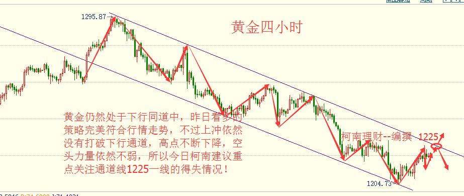 黄金多单斩获9美金,原油坚定空完美止盈,天然气看多不变! 黄金技术分析: 黄金昨日日线在1219.87收了一根上引线较长的阳柱,形成了日线三连阳,并类似红三兵的形态。目前金价运行于5日及10日均线之间,布林带开口走下,下轨延伸至1205附近,中轨在1234存在强阻,附图macd快慢线死叉趋于走平,下行动能柱缩量中;四小时图