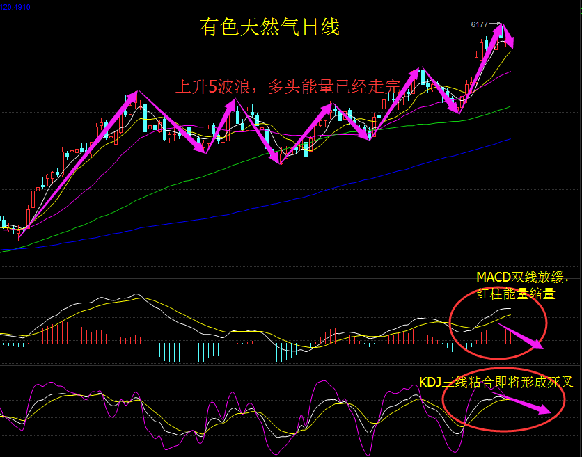 柯南理财:天然气杀跌时机已到,10.12气银油操作策略! 有色天然气技术分析: 天然气在六连阳之后首度收阴,这意味着目前已经阶段性的见顶。昨日说的的中线空单,资金量比较可观的朋友已经开始进场,5825位置若能有效破位,下方空间将会完全打开,利润保守预计300个点。日线附图指标MACD放量上行;KDJ三线有拐头向下的迹象